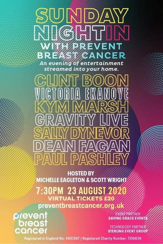 If you do want to support Prevent Breast Cancer and have a fun #SundayNightIn then tickets for the online event cost £20 per household and are available by clicking the link below.